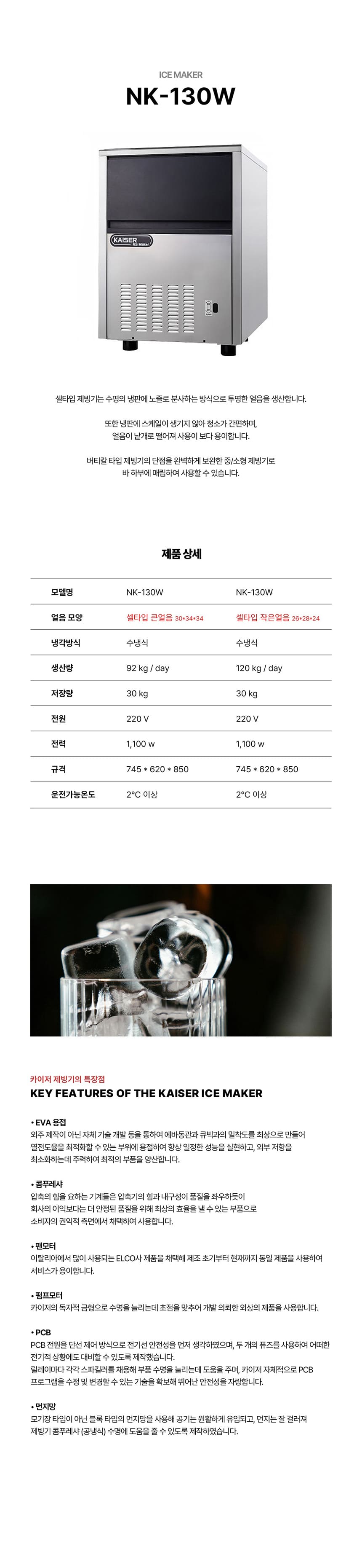 NK-130W 유버스 [카이저] 수랭식 제빙기 92kg 제품분류 제빙기 업소용 AS기간 1년 최저 렌탈가 월 106,500 (렌탈가) 제휴카드 할인가 월 (렌탈가) 3년 4년 5년 할인 제휴카드 보기 렌탈신청 장바구니