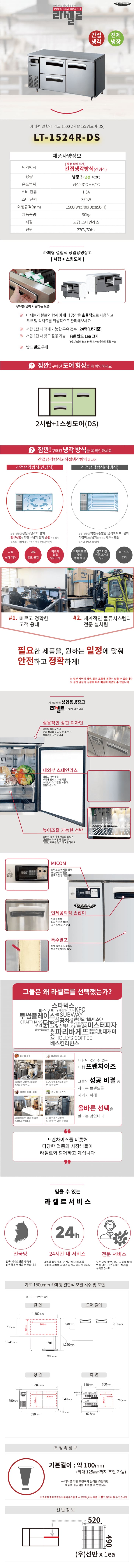 LT-1524R-DS 유버스 [라셀르] 간냉식 우유서랍 1500 테이블 냉장고 402L 올스텐 제품분류 업소용 용량(총량) 400L이상 기능 3도어 AS기간 1년 최저 렌탈가 월 91,900 (렌탈가) 제휴카드 할인가 월 (렌탈가) 3년 4년 5년 할인 제휴카드 보기 렌탈신청 장바구니