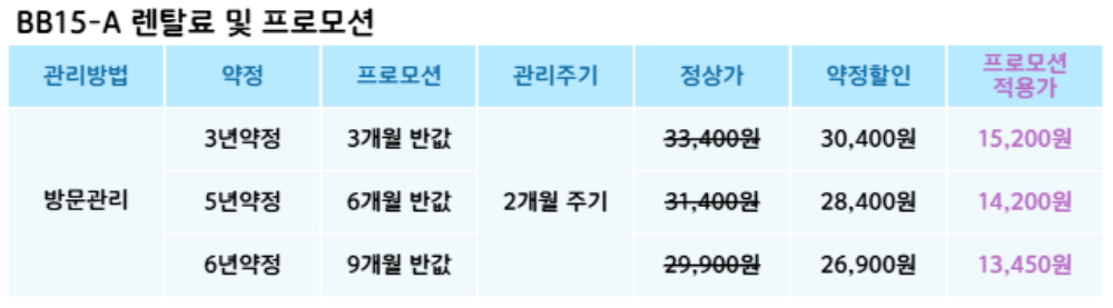 BB15-A 코웨이 [코웨이] 연수기 제품분류 연수기 AS기간 렌탈기간내 최저 렌탈가 월 26,900 (렌탈가) 제휴카드 할인가 월 (렌탈가) 3년 5년 6년 방문관리/2개월 할인 제휴카드 보기 렌탈신청 장바구니